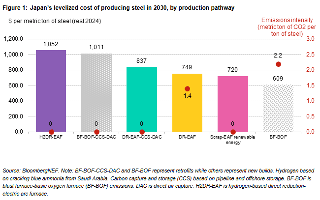 Tokyo, December 3, 2025 – Emissions from Japan’s coal-based steel production will need to be cut if Japan is to achieve its 2050 net zero goal. The steel sector, which is responsible for about 13% of the country’s emissions, faces structural and economic pressures from declining domestic demand and intensifying global competition. Japan will require innovation and supporting policies to take advantage of all low-emission pathways for steel production to stay on track for its climate goals while preserving cost competitiveness, according to BloombergNEF’s latest report, Decarbonization of Japan’s Steel Industry: Economics and Path Forward, commissioned by Tokyo Steel Manufacturing Co.