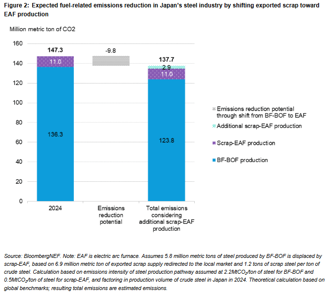 While most low-emission steel pathways are still emerging, Japan could begin to lower emissions from its steel sector by maximizing production at existing scrap-EAFs. BNEF’s analysis finds that this is currently one of the most economical pathways for low-emissions steel in Japan. The government could provide further support by introducing policies to redirect currently exported scrap volumes to the domestic steel sector. Based on BNEF analysis, the 6.9 million tons of scrap steel Japan exported in 2023 could enable production of 5.8 million tons of lower-carbon EAF-based steel, assuming 1.2 tons of scrap is used to produce each ton of steel. This would potentially help Japan avoid 9.8 million tons of direct CO emissions, or about 7% of Japan’s steel sector so-called Scope 1 and 2 emissions in 2024 (Figure 2). An additional 13.9 million tons of CO could be abated by powering the scrap-EAF process with clean power. This would bring total potential emissions reductions to 23.7 million tons of CO.