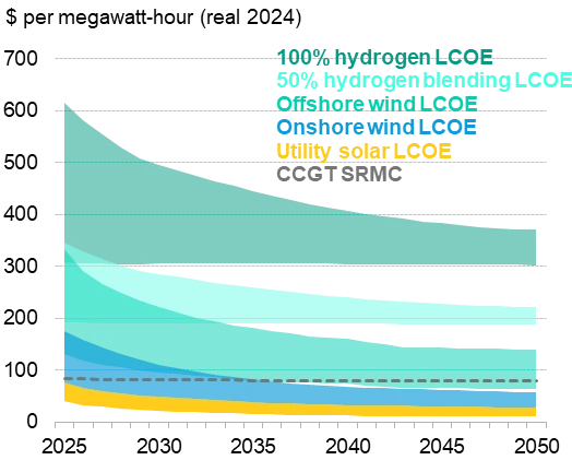 Figure 1: Levelized cost of electricity for new renewables and retrofitted combined-cycle gas turbines (CCGTs) for hydrogen in the Philippines, compared against the short-run marginal cost of existing CCGTs