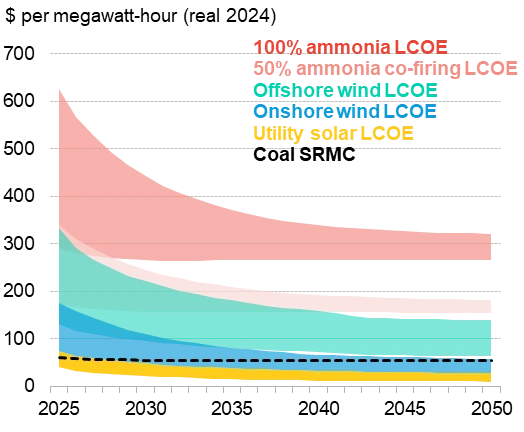 Figure 2: Levelized cost of electricity for new renewables and retrofitted coal power plants for ammonia in the Philippines, compared against the short-run marginal cost of existing coal plants