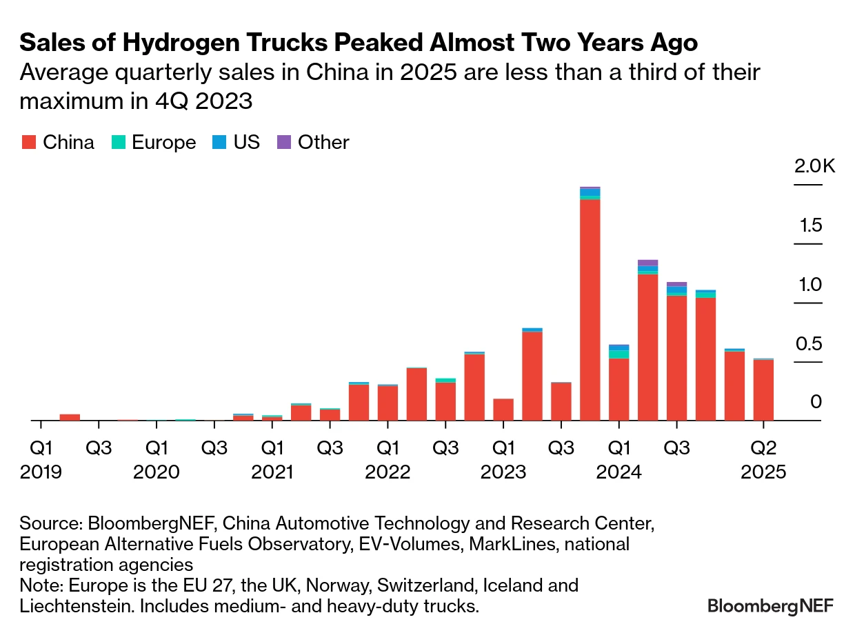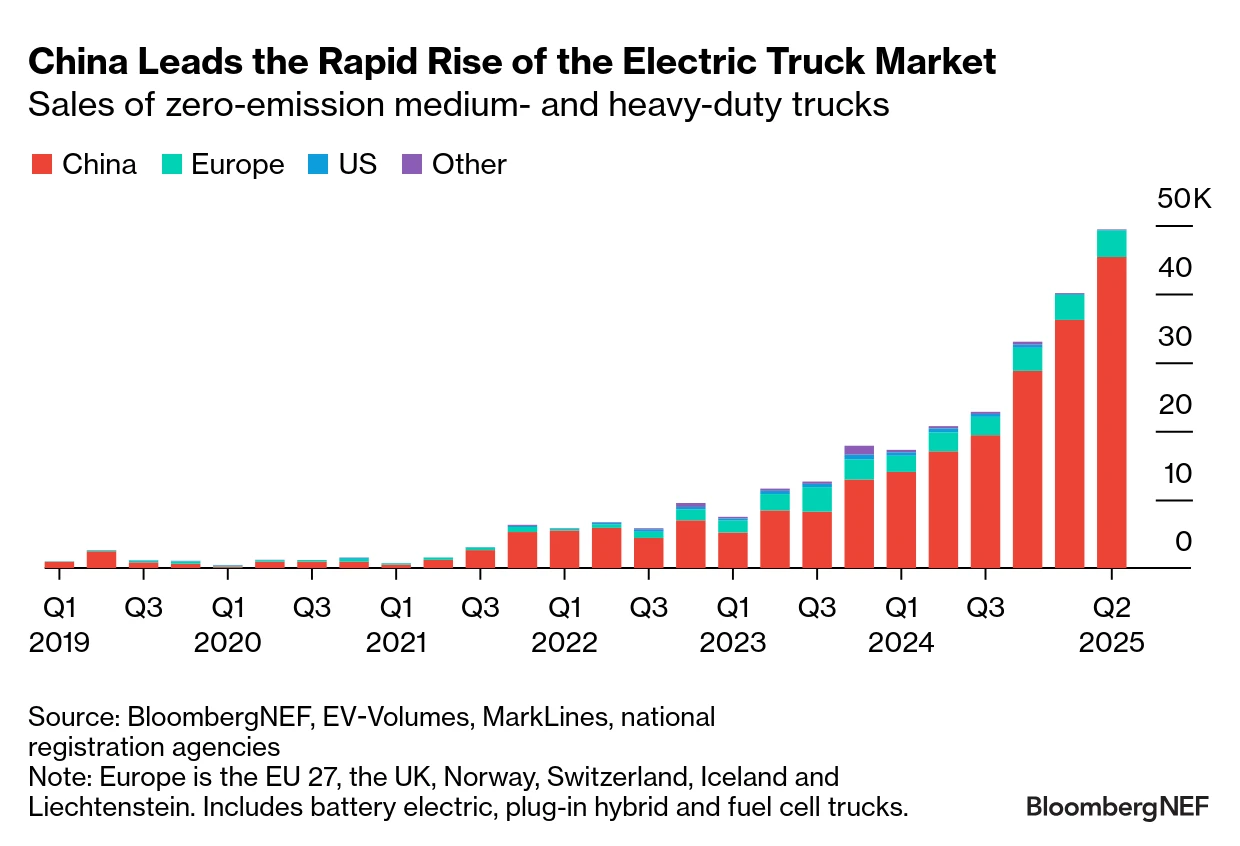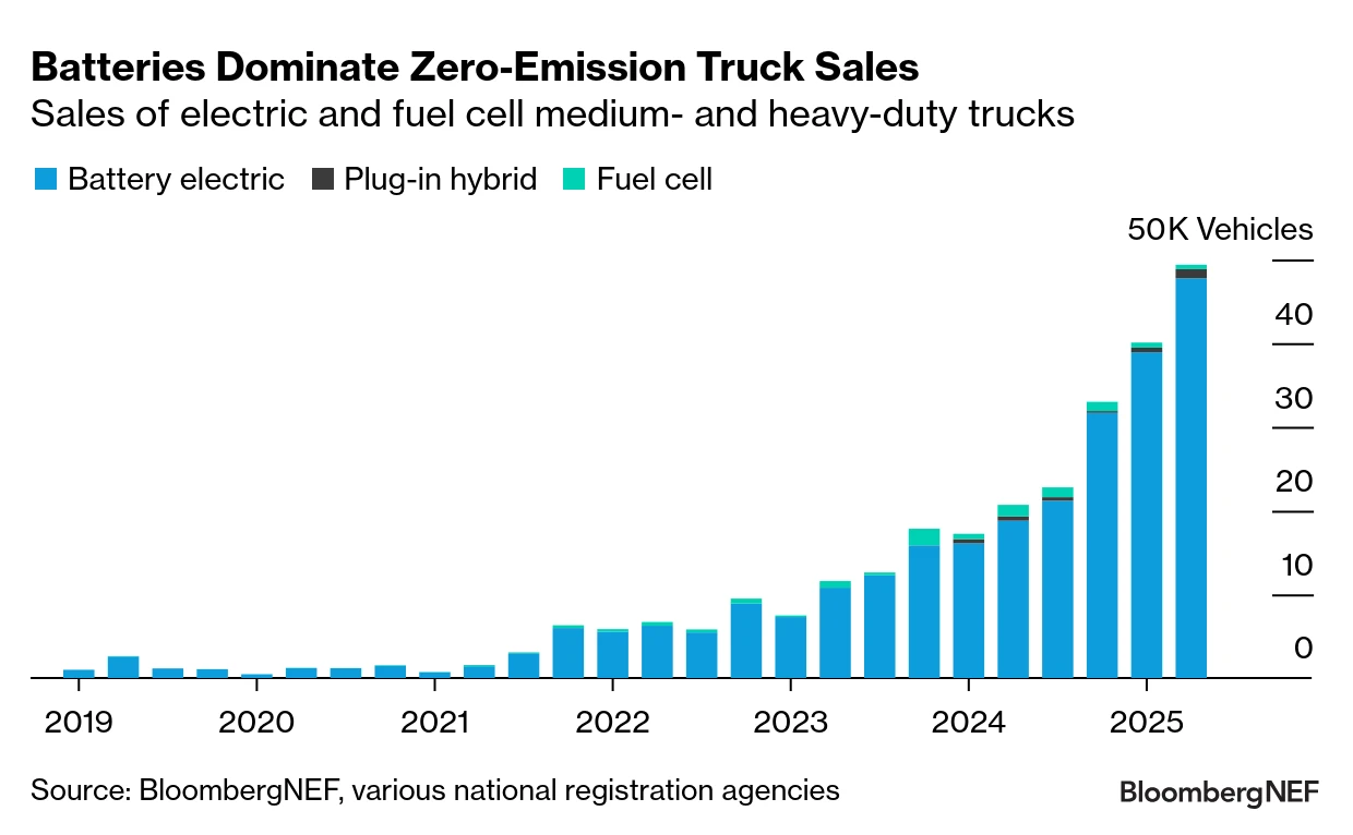 Over 89,000 electric trucks were sold in the first half of 2025, up 140% from the same period last year. China accounted for almost 80,000 of those, with sales in Europe making up most of the balance. US sales shrunk to just 200 units.