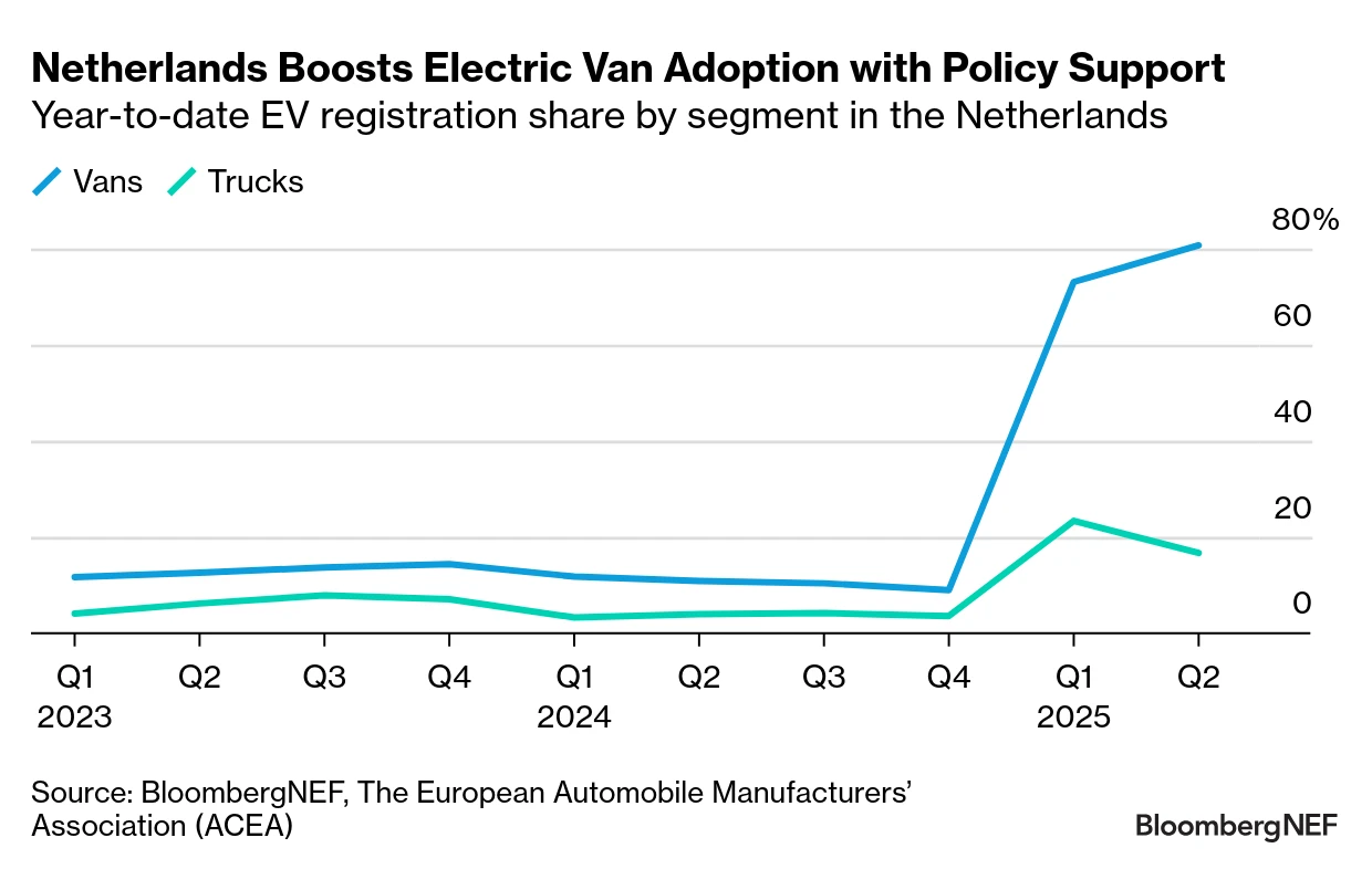 City policies are playing a growing role. Electric commercial van purchases skyrocketed in the Netherlands to reach more than 80% of sales in the first half of this year, the highest globally, after the government allowed municipalities to designate urban zero-emissions zones. So far, 18 cities, including Amsterdam, The Hague and Eindhoven, have introduced such zones, with 11 more in planning.
