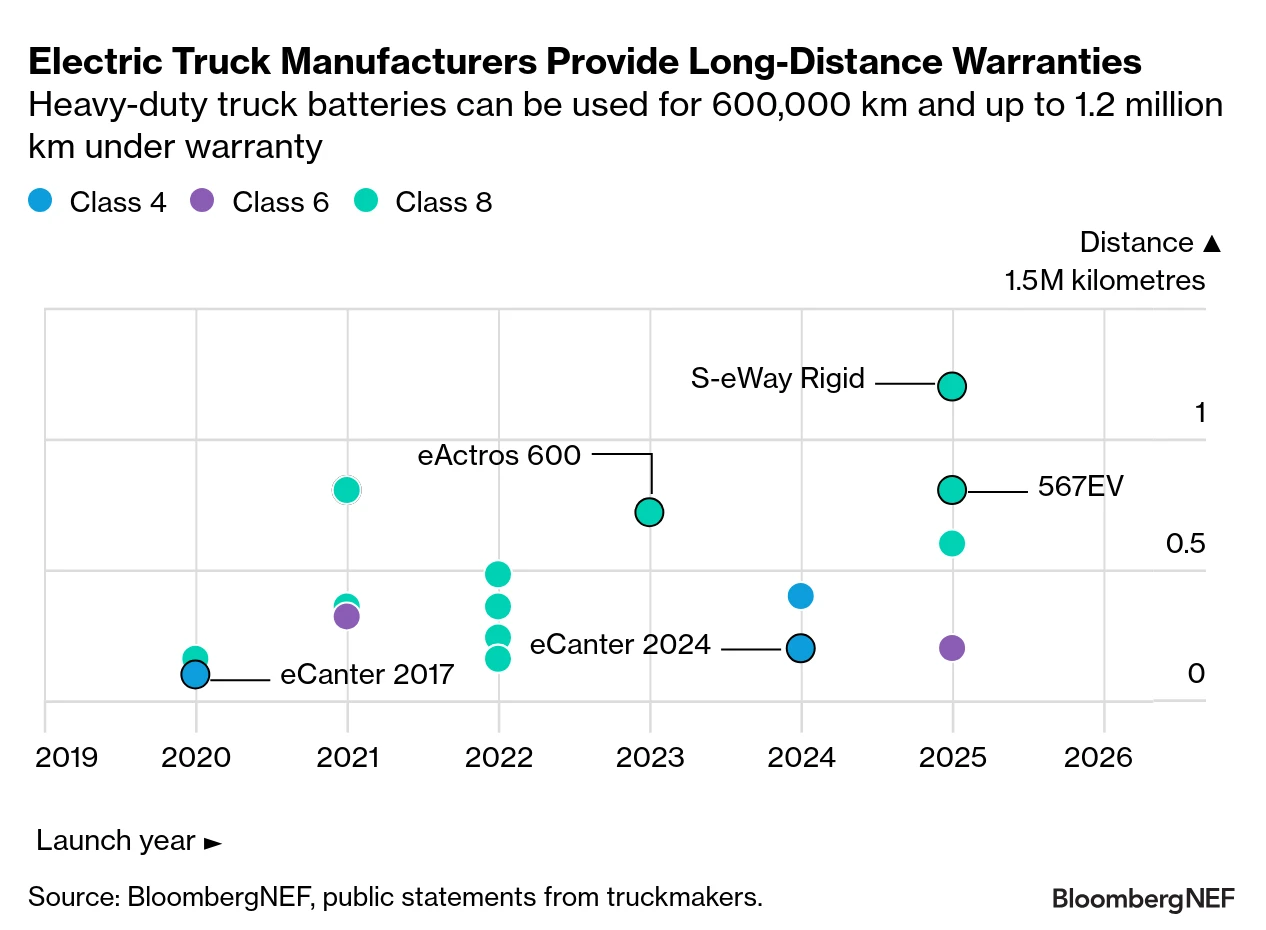 Long-haul models like the Mercedes-Benz eActros 600 now offer a battery warranty of more than 700,000 kilometers, while Iveco offers one at 1.2 million kilometers (750,000 miles). Some warranties have doubled with the latest iteration truck models. Longer battery warranties will help reduce depreciation rates for electric trucks, which have been high for some early offerings.