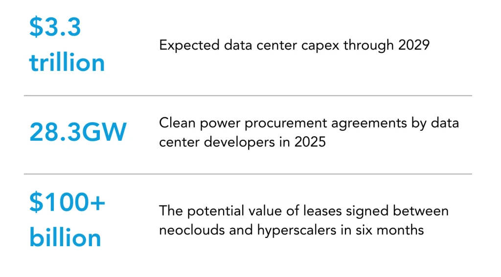 For neoclouds, hyperscaler offtake has been critical to securing project financing and scaling buildouts, although these contracts are for much shorter periods than total asset life, which exposes the neoclouds to risk if long-term demand for AI compute is lower than expected.