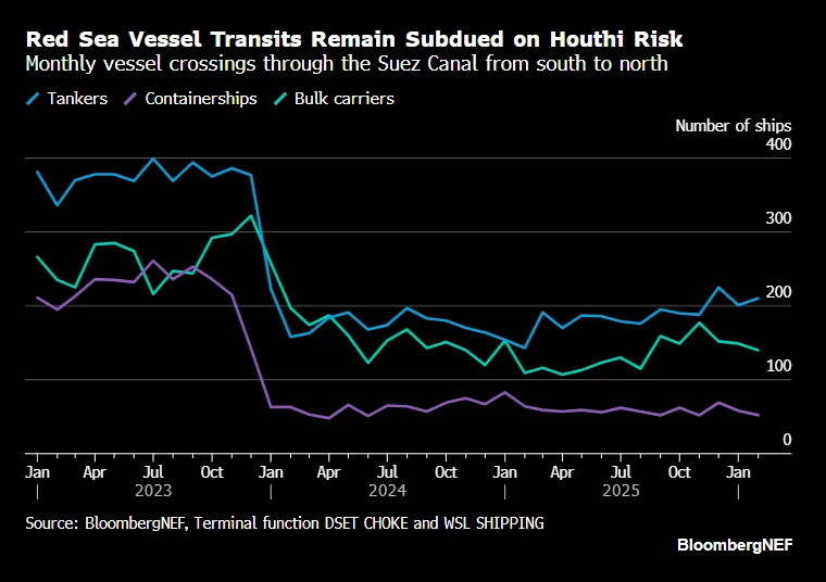 The most obvious is, of course, even more conflict. Strikes from the Houthis on Red Sea traffic may have ended following last year’s Israel-Hamas ceasefire, but the Iranian proxy could still prove highly disruptive once again — adding to the disruption.