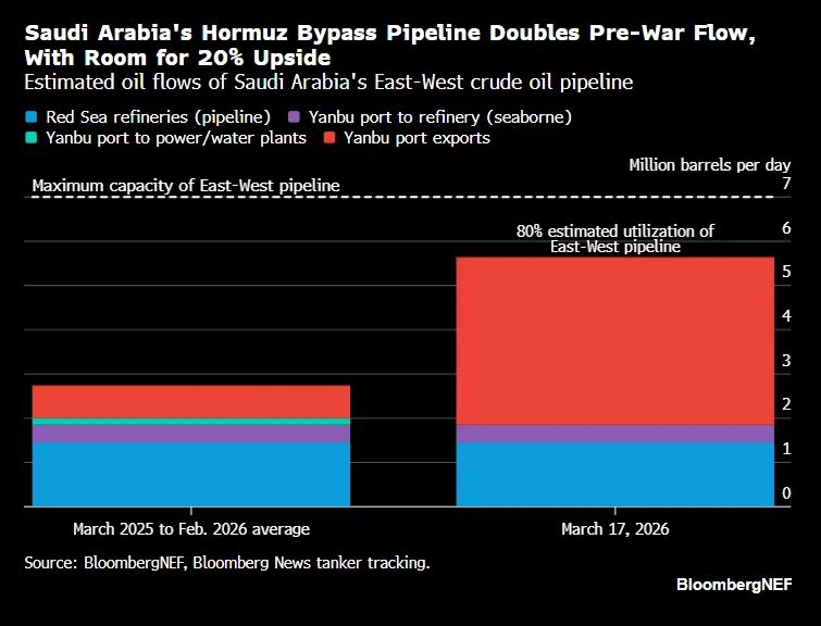 As it stands, the global oil supply is set to dive by 8 million barrels per day in March, according to the International Energy Agency. In the best case – if pipeline, port and shipping capacities operate at their peak – the Saudi Hormuz bypass strategy could divert around 4.3 million barrels per day of incremental pipeline flows. BNEF estimates that Saudi has already reached close to 3 million barrels per day of incremental flows, doubling the pre-war utilization of the East-West pipeline to 80% on March 17, 2026.