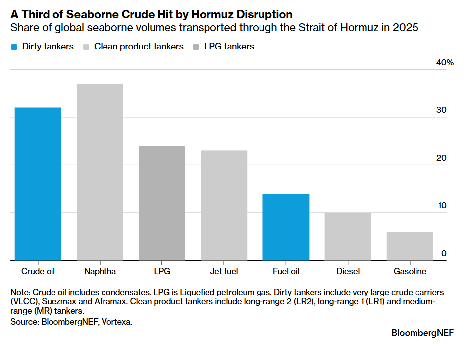 About 14 million barrels per day, or 32% of global seaborne crude oil, normally transit through the strait of Hormuz, trade which is all but stopped.