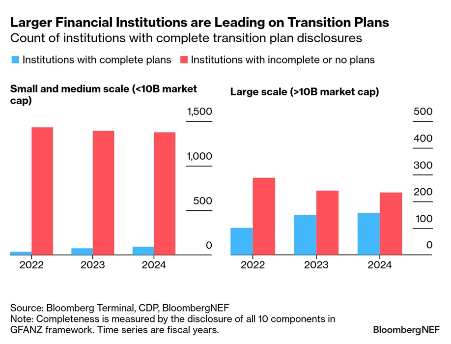 Larger institutions tend to have more complete transition plans. Among the largest financials with market caps above $10 billion, 40% by count disclosed complete plans in the last fiscal year. In contrast, only 6% of smaller institutions (under $10 billion in market capitalization) released information on all 10 components.
