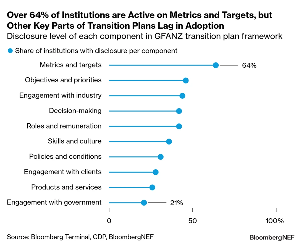 Transition plans outline companies’ strategies to achieve their climate commitments. According to new BloombergNEF research tracking over 2,000 financial institutions, 44% of the sector by market capitalization has disclosed complete transition plans across all 10 components of a best-practice framework.