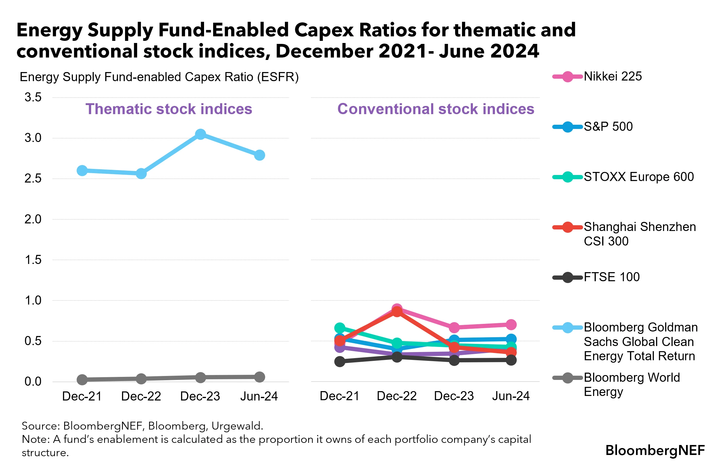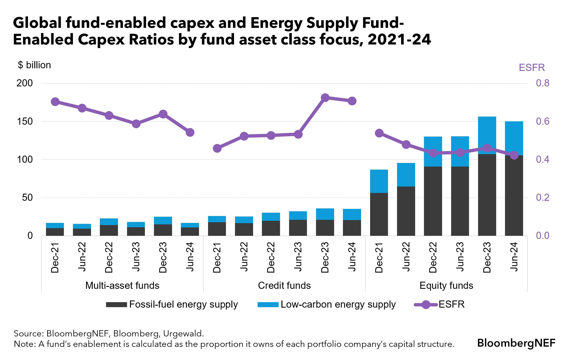 - BloombergNEF’s Energy Supply Fund-Enabled Capex Ratio (ESFR) is a new metric that measures climate alignment of investment portfolios, analyzing how they enable capital investment into energy supply assets.