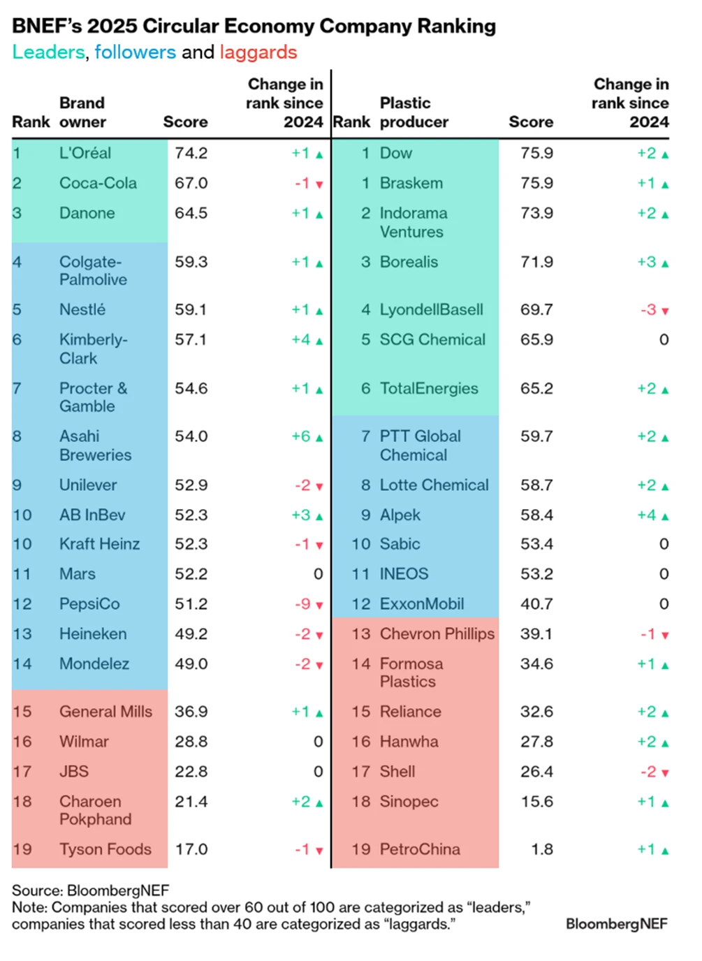BNEF’s Circular Economy Company Ranking measures selected companies’ circular economy ambition based on publicly announced targets and commitments from their 2024 company reports. Both brand owners and plastic producers are split into three tiers – leaders, followers and laggards – based on BNEF’s ranking methodology.