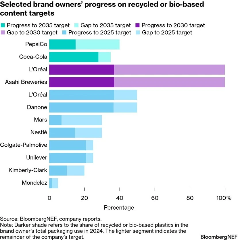 Despite the slowing ambition, some brand owners are making progress. Colgate-Palmolive increased the recycled content in its plastic packaging from 18% in 2023 to 21% in 2024 and is on track to meet its 25% target for 2025.