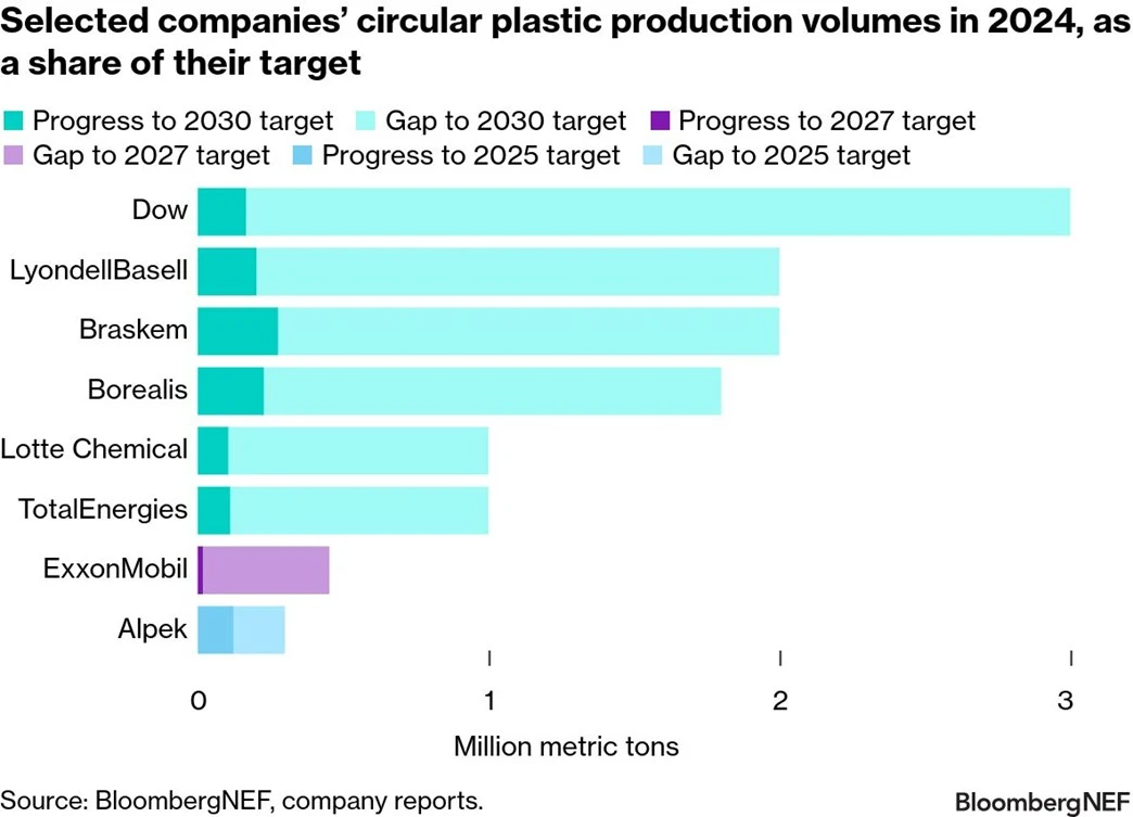 Indorama, Alpek and Braskem have made the strongest progress toward their production targets in 2024. However, most plastic producers still have a long way to go. Insufficient demand for recycled products is one of the biggest challenges that producers face.